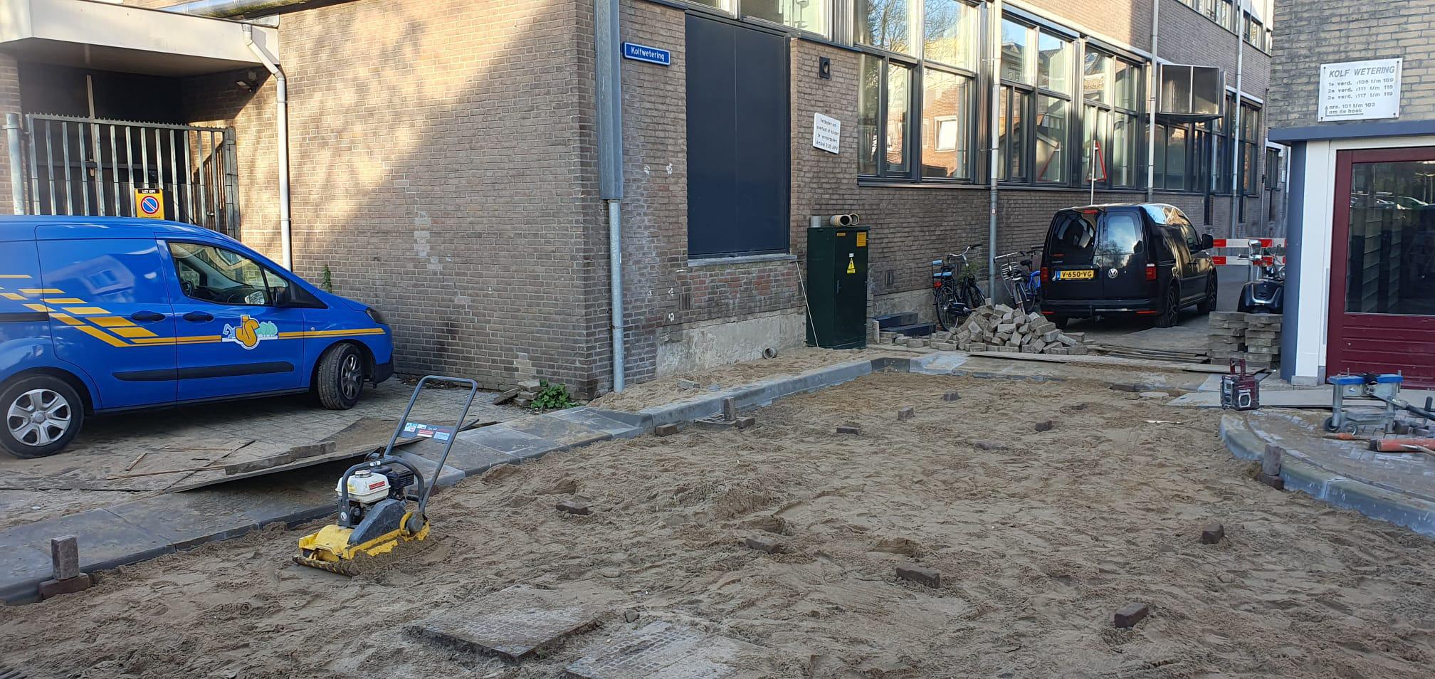 In de Dijkstraat, ter hoogte van parkeerplaats Klein Amerika, vervangen we de oude bestrating door nieuwe stenen. Ons doel is om deze week de verbinding met de Kolfwetering te herstellen, zodat u hier zo snel mogelijk weer gebruik van kunt maken.
